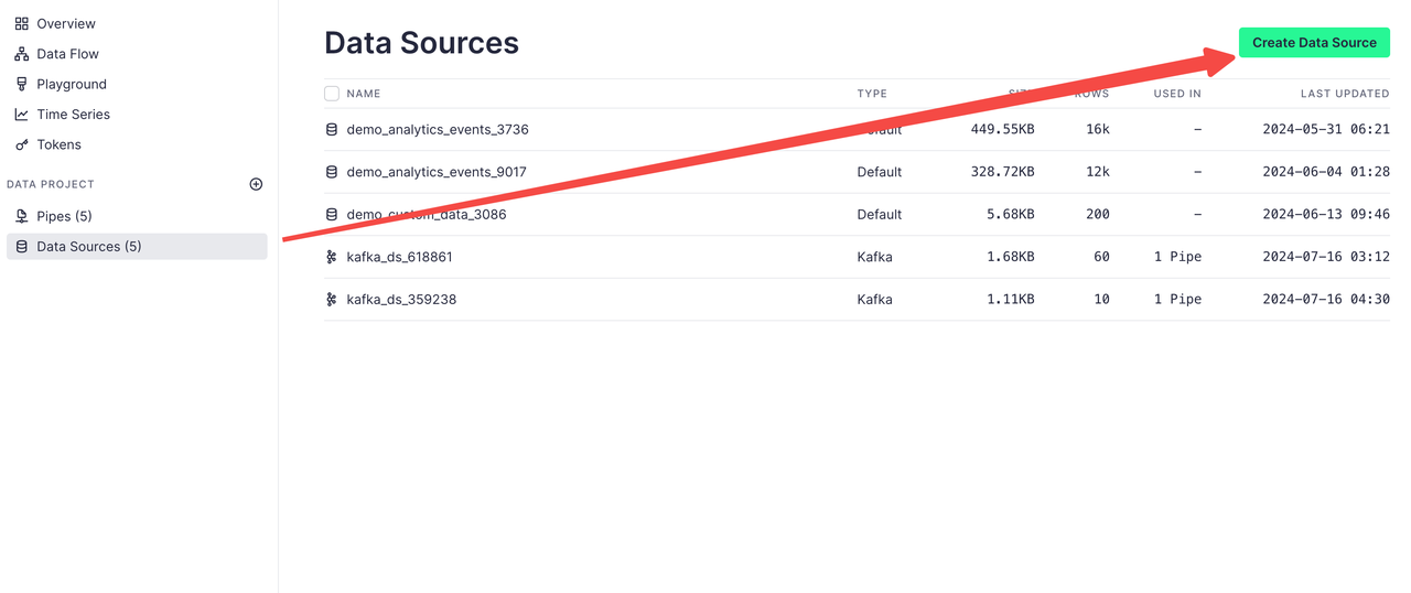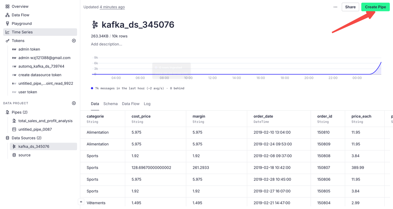 点击刚刚我们创建的数据源,在点击页面上的 Create Pipe 即可创建管道: