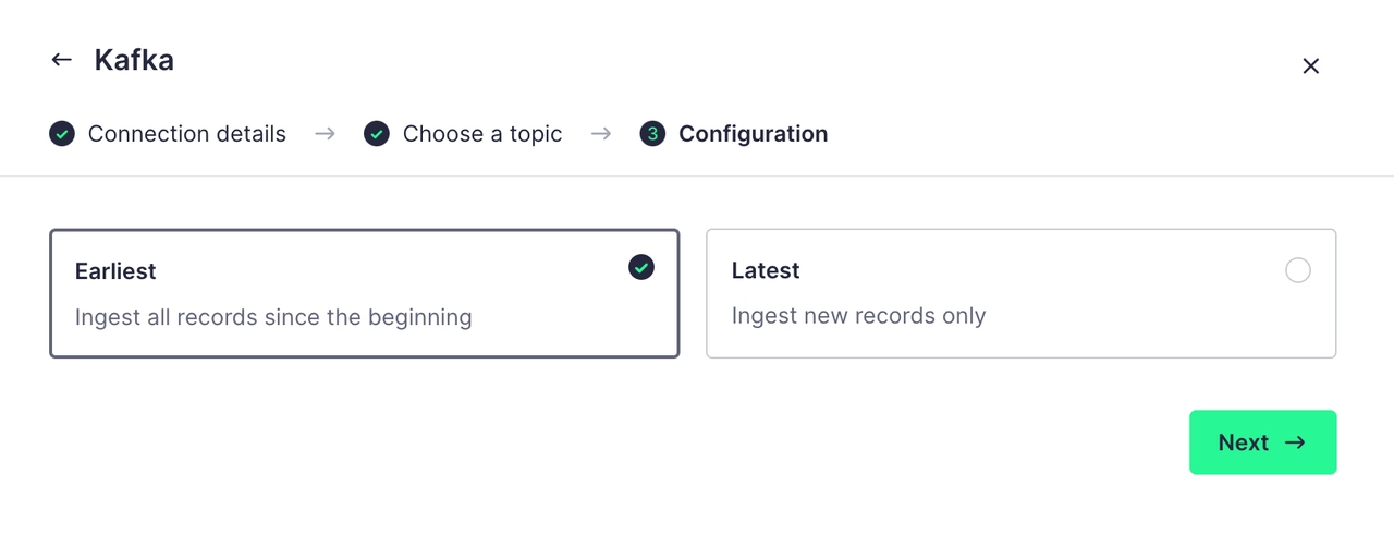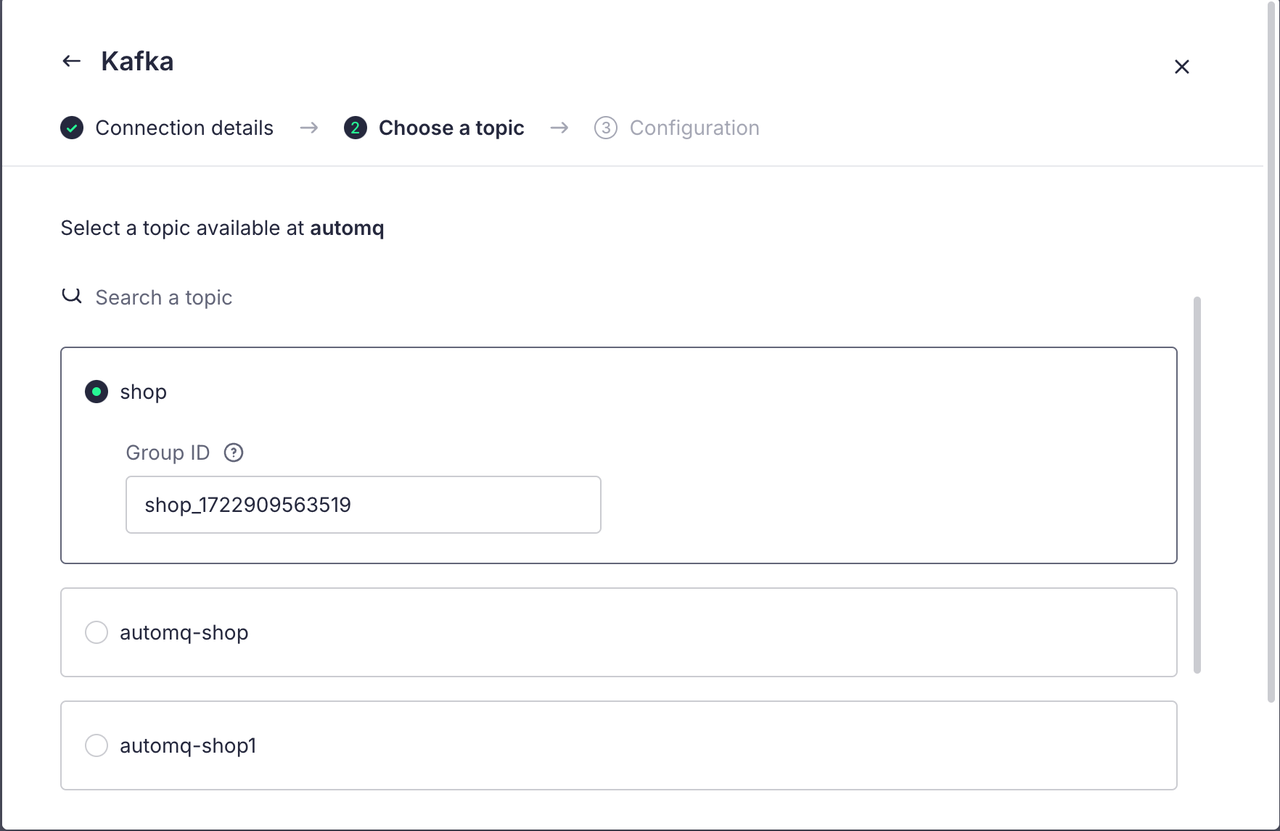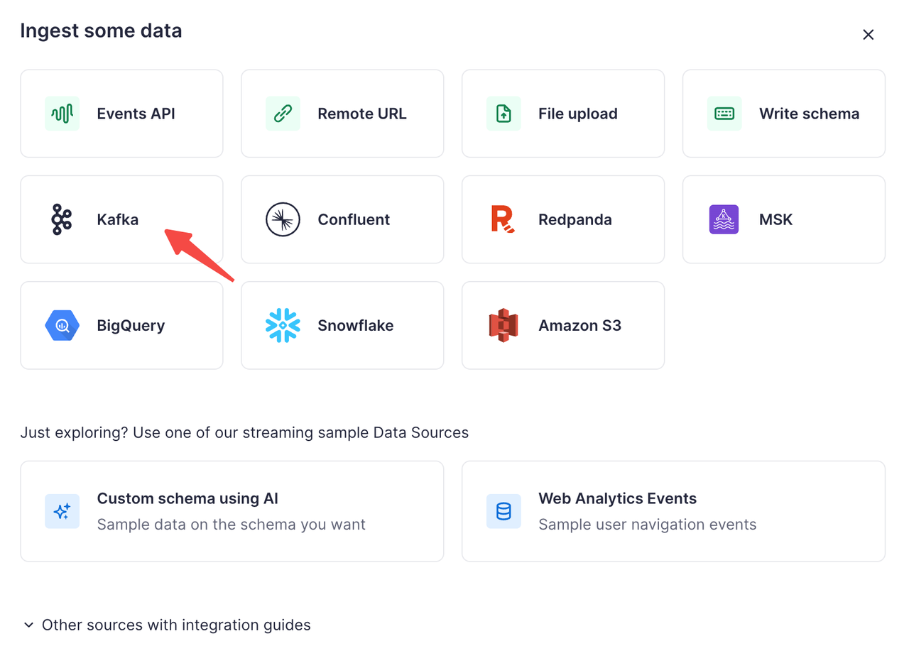 由于 AutoMQ 是对 Kafka 100% 兼容的,所以我们可以点击以 Kafka 形式导入数据: