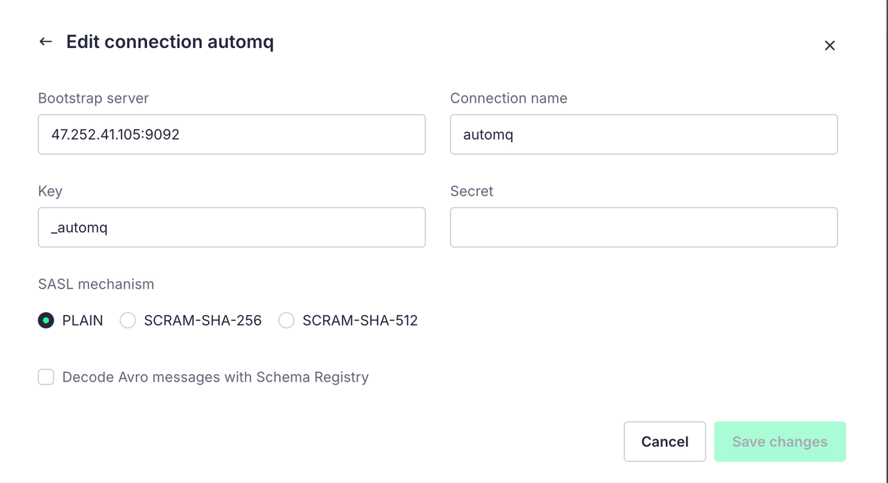 sasl.jaas.config=org.apache.kafka.common.security.plain.PlainLoginModule required username="_automq" password="automq-secret";