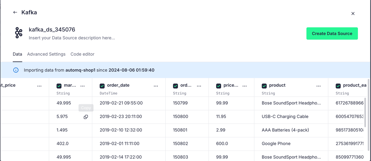 点击 Create Data Source 我们就成功的将 AutoMQ 的 Topic 与 Tinybird 进行了连接,接下来这个 Topic 上的数据都会被 Tinybird 接收到。数据源面板如下: