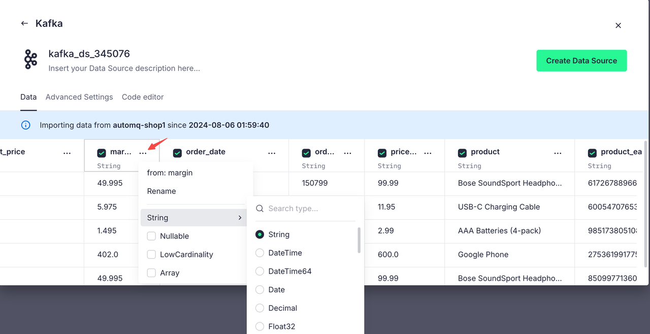 完成配置后,Tinybird 会自动解析 Topic 的数据格式并将其按表格展示出来: