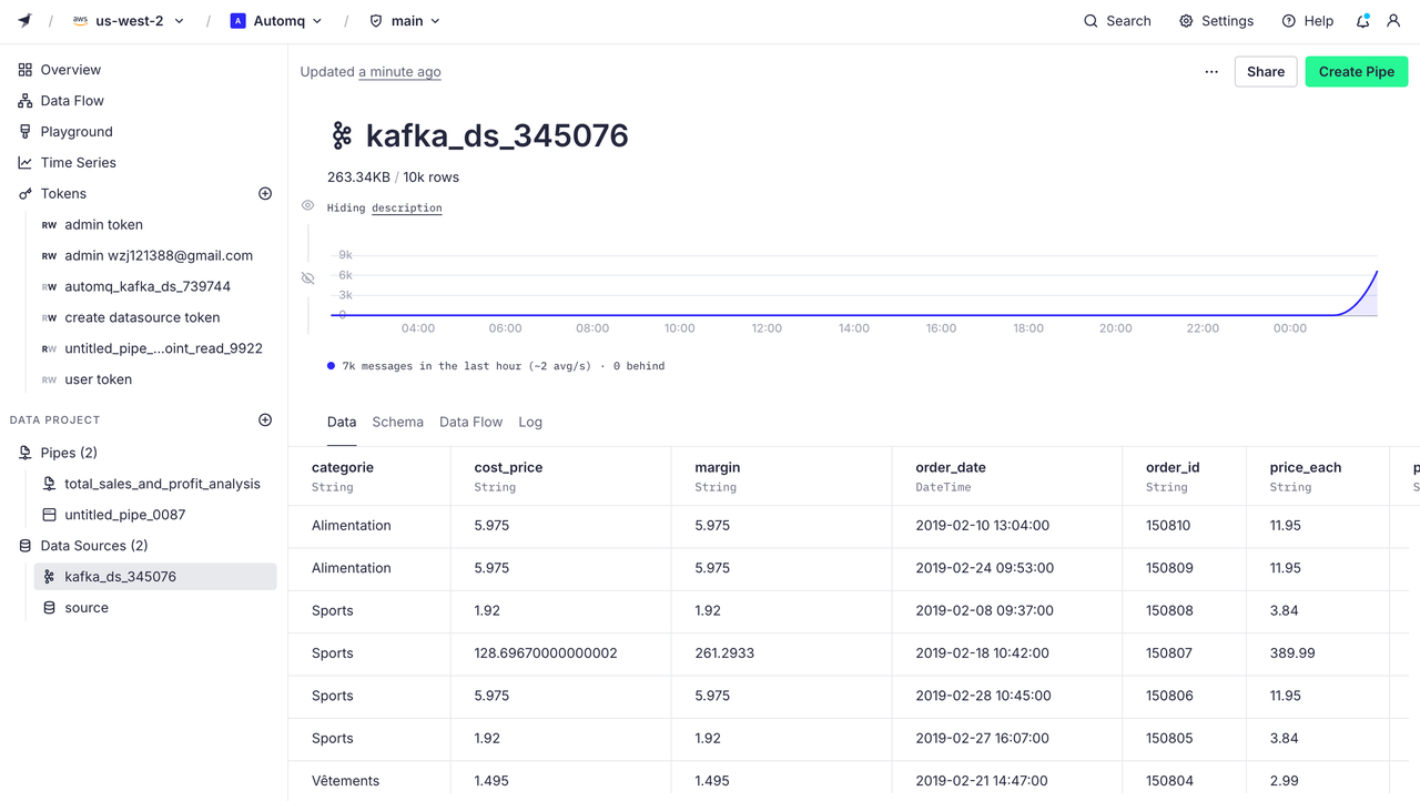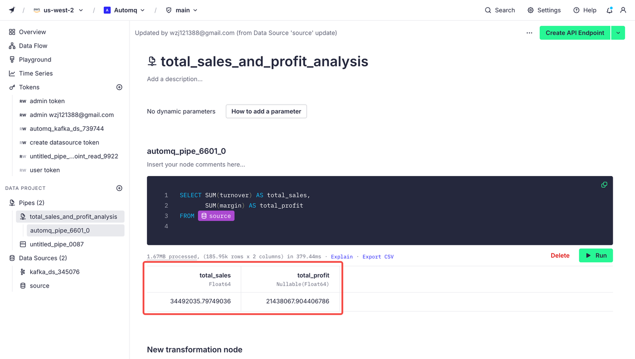 现在我们成功地建立了 AutoMQ 与 Tinybird 的连接,并利用 Tinybird 支持的 SQL 进行了数据分析操作。