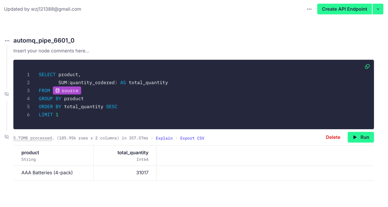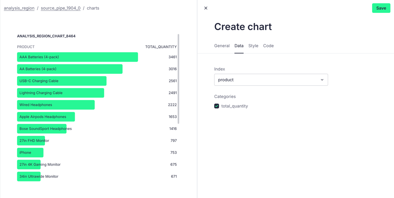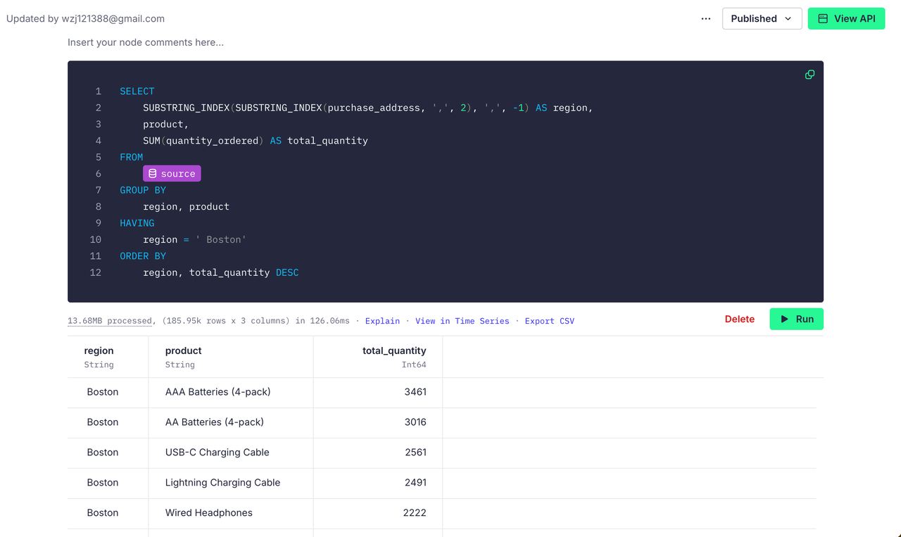 Tinybird 同样支持我们进行复杂的 SQL 编写,比如说我们想要知道哪个产品销量最高,我们可以这样写: