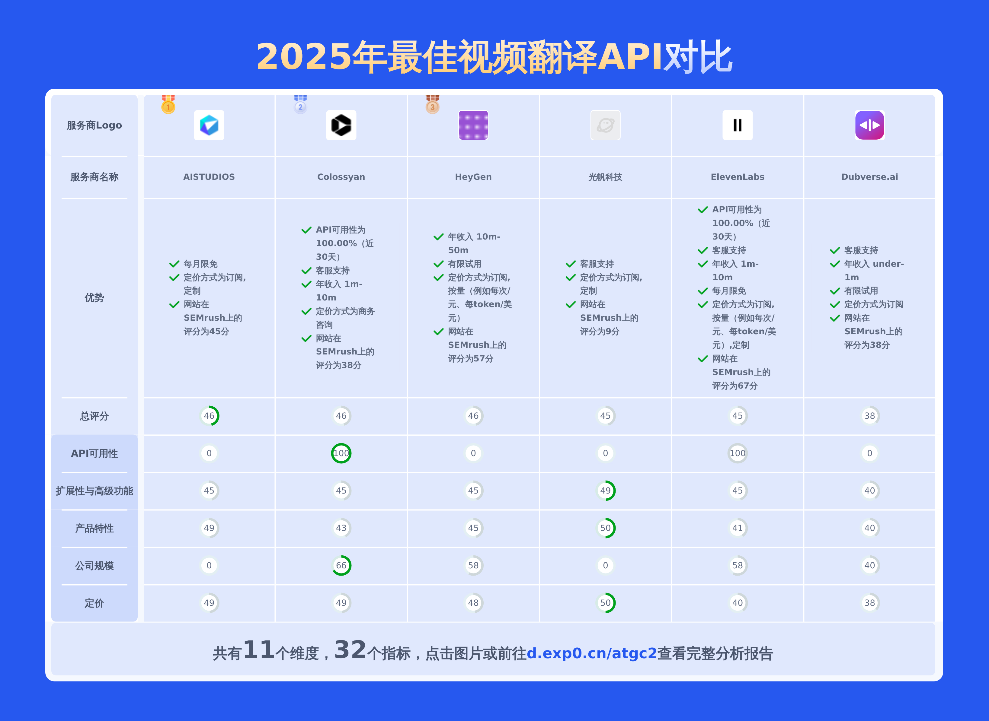 视频翻译API是一种通过自动化技术将视频内容翻译成多种语言的工具,广泛应用于跨境电商、在线教育和媒体传播等领域。面对众多API服务提供商,选择最适合的解决方案尤为重要。我们的深度比较报告从产品优势、定价、产品特性、扩展性与高级功能等维度进行全面分析,通过丰富的数据和详细的对比信息,帮助用户快速了解各服务商的优劣势,做出明智的选择。此报告为用户提供了专业、客观的参考,助力其在实际应用中提升效率和效果。