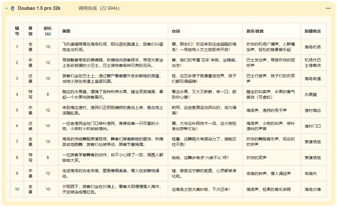 doubao-1.5-pro-32k最新一代专业版大模型,单价不提升的同时,模型能力有大幅提升。视频脚本生成效果如下: