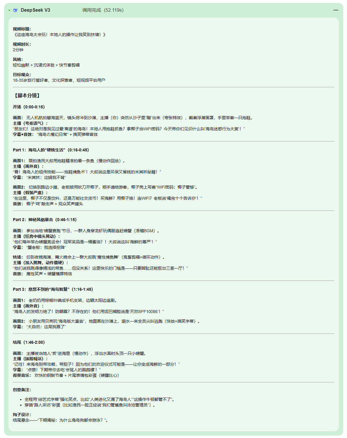 DeepSeek-V3 是由深度求索(DeepSeek)公司开发的一款先进的开源大语言模型,采用混合专家(MoE)架构,拥有 671B 总参数,其中每 token 激活 37B 参数。模型在 14.8 万亿高质量 token 上进行预训练,并通过监督微调和强化学习进一步优化。视频脚本生成效果如下: