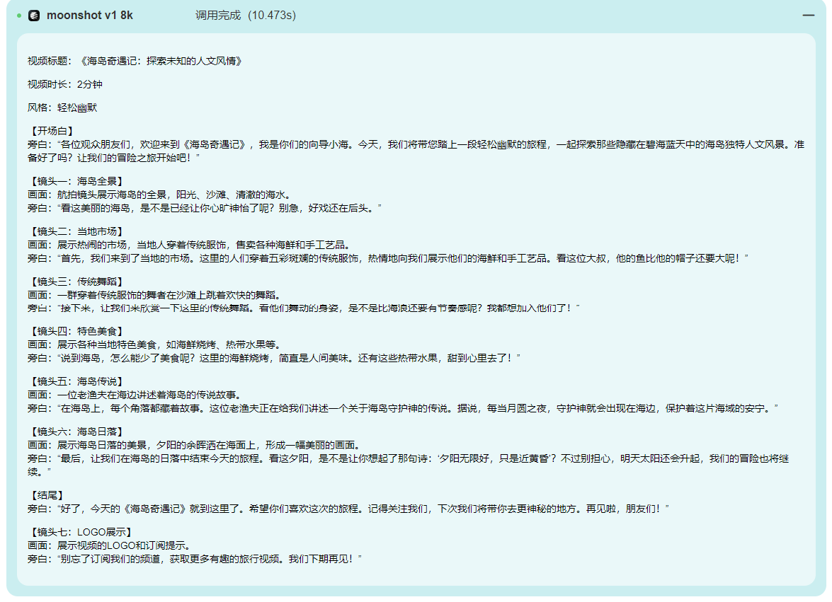 Moonshot-v1-8k是Moonshot AI推出的一款千亿参数的语言模型,支持8K上下文窗口,特别适合长文本的理解和内容生成场景。它具备优秀的语义理解、指令遵循和文本生成能力,能够根据用户输入生成相应的文本输出,广泛应用于内容创作、代码生成、文本摘要等领域。视频脚本生成效果如下: