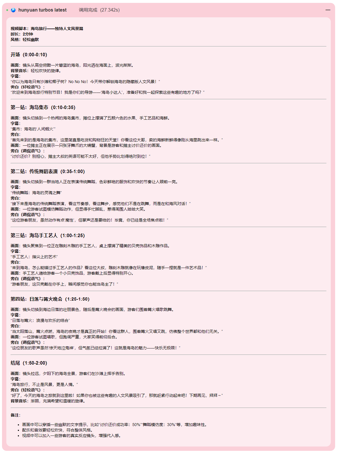 Hunyuan-Turbos-Latest是腾讯混元团队推出的新一代快思考模型,具备高速响应和高效性能,能够实现“秒回”。该模型在知识、数学、推理等多个领域表现出色,具备广泛的知识覆盖和准确的推理能力。用户可以通过腾讯云API调用该模型,享受高速、高效的模型服务。视频脚本生成效果如下: