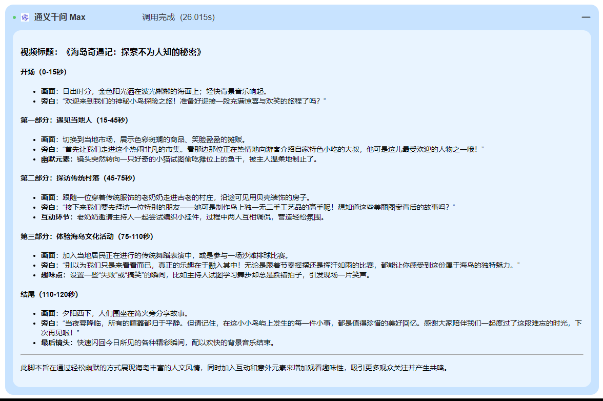 通义千问-Max 是阿里云通义千问系列中的旗舰大语言模型,专为复杂、多步骤任务设计。它基于混合专家(MoE)架构,拥有超过20万亿token的预训练数据,展现出强大的性能。通义千问-Max 在理解能力、逻辑推理、指令遵循和代码能力上表现优异,尤其在中文语境下,其文本理解、生成、知识问答和安全风险控制能力可媲美甚至超越部分国际领先模型。视频脚本生成效果如下: