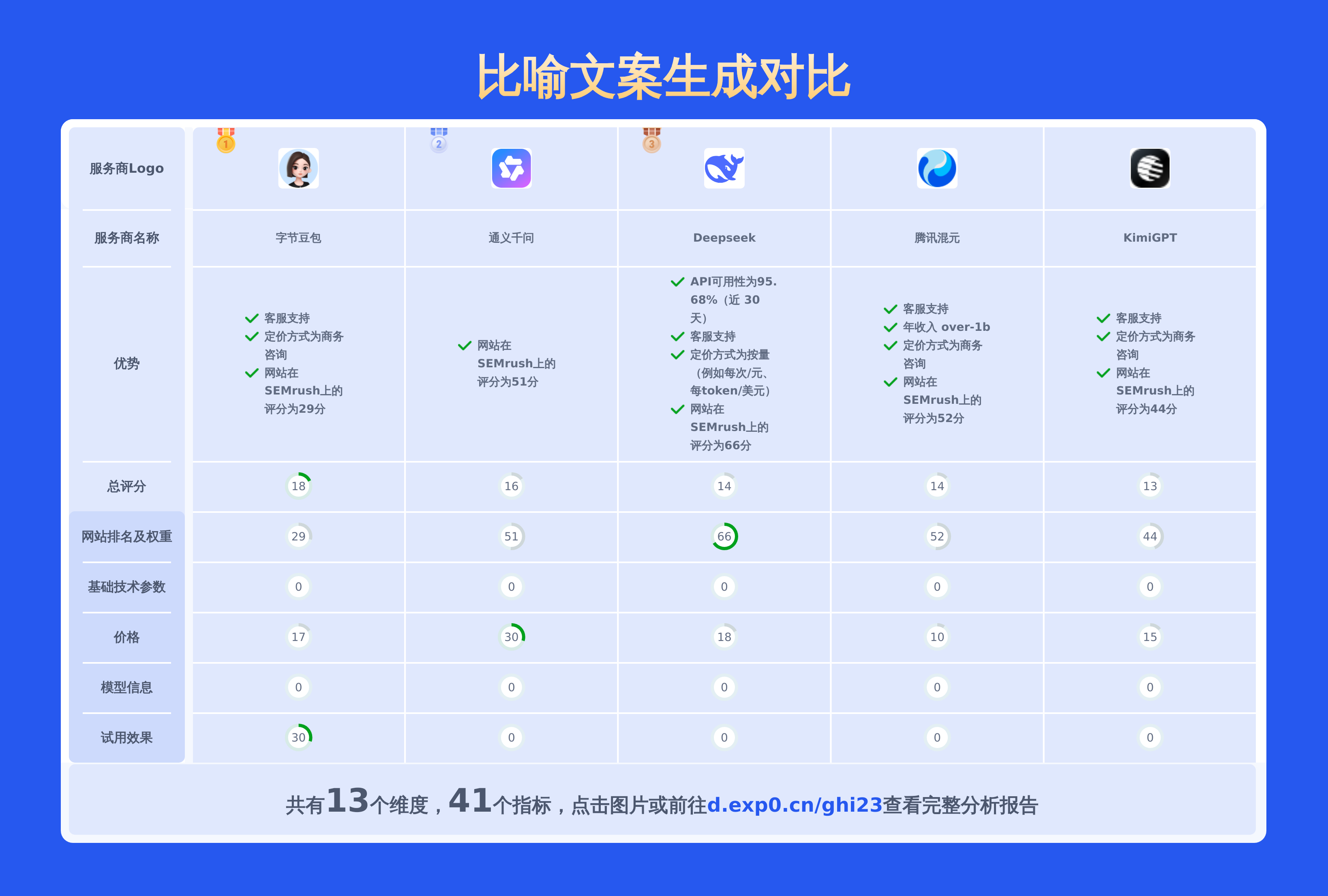 比喻文案的生成如同一支画笔,为文案润色增添生动色彩,在 AI 文本生成中尤为关键。一篇出色的文章,若辅以精妙的文案润色,便如锦上添花,不仅提升整体质感,更能深深吸引读者驻足品读。因此,挑选一个合适的服务提供商成为重中之重。我们精心打造了一份深度比较报告,从产品优势、模型信息、价格、基础技术参数到试用效果等多维度展开分析。这份报告如同一张详尽的地图,汇聚丰富数据与细致对比,助力用户迅速洞悉各服务商的优劣势,轻松做出明智抉择。