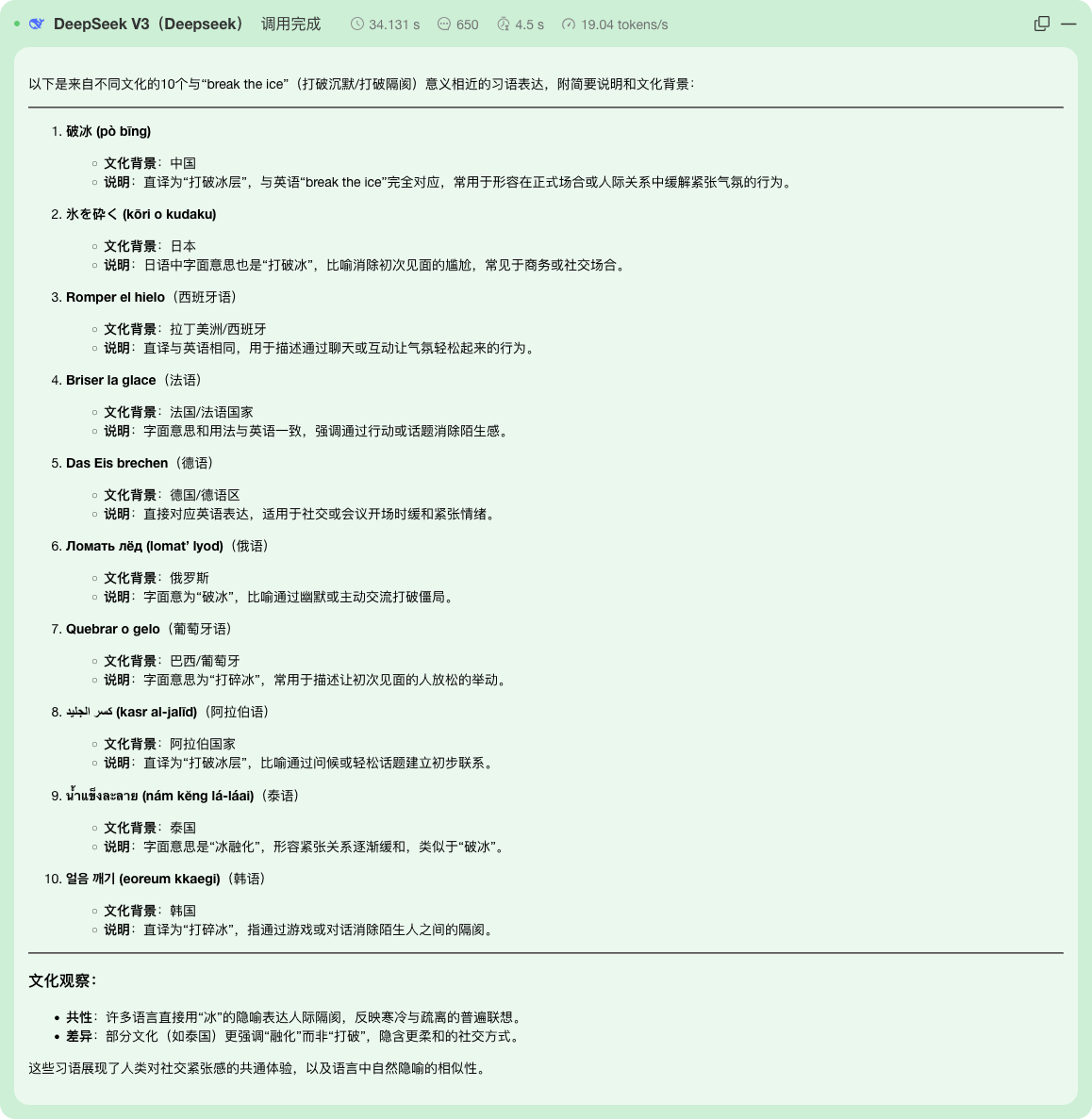 通义千问 Max输出结果准确捕捉了跨文化习语的多样性,而DeepSeek V3则提供了更丰富的文化背景和具体语境,两者均有效地展示了如何“打破沉默”