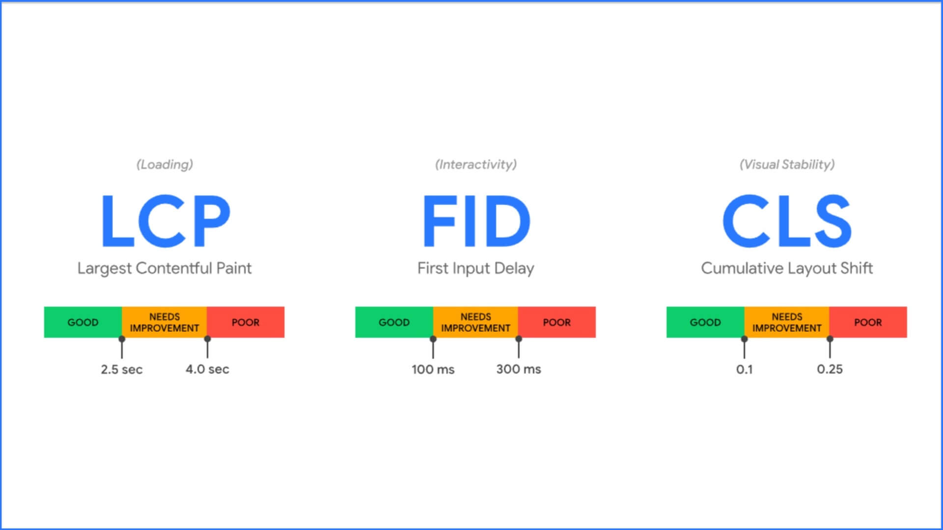 核心网页指标是 Google 用来评估网页健康度和性能的用户体验指标,并且在 Google 搜索排名算法中持续发挥着一点点作用。这些指标旨在衡量用户体验的几个关键方面:加载速度、交互性和视觉稳定性。