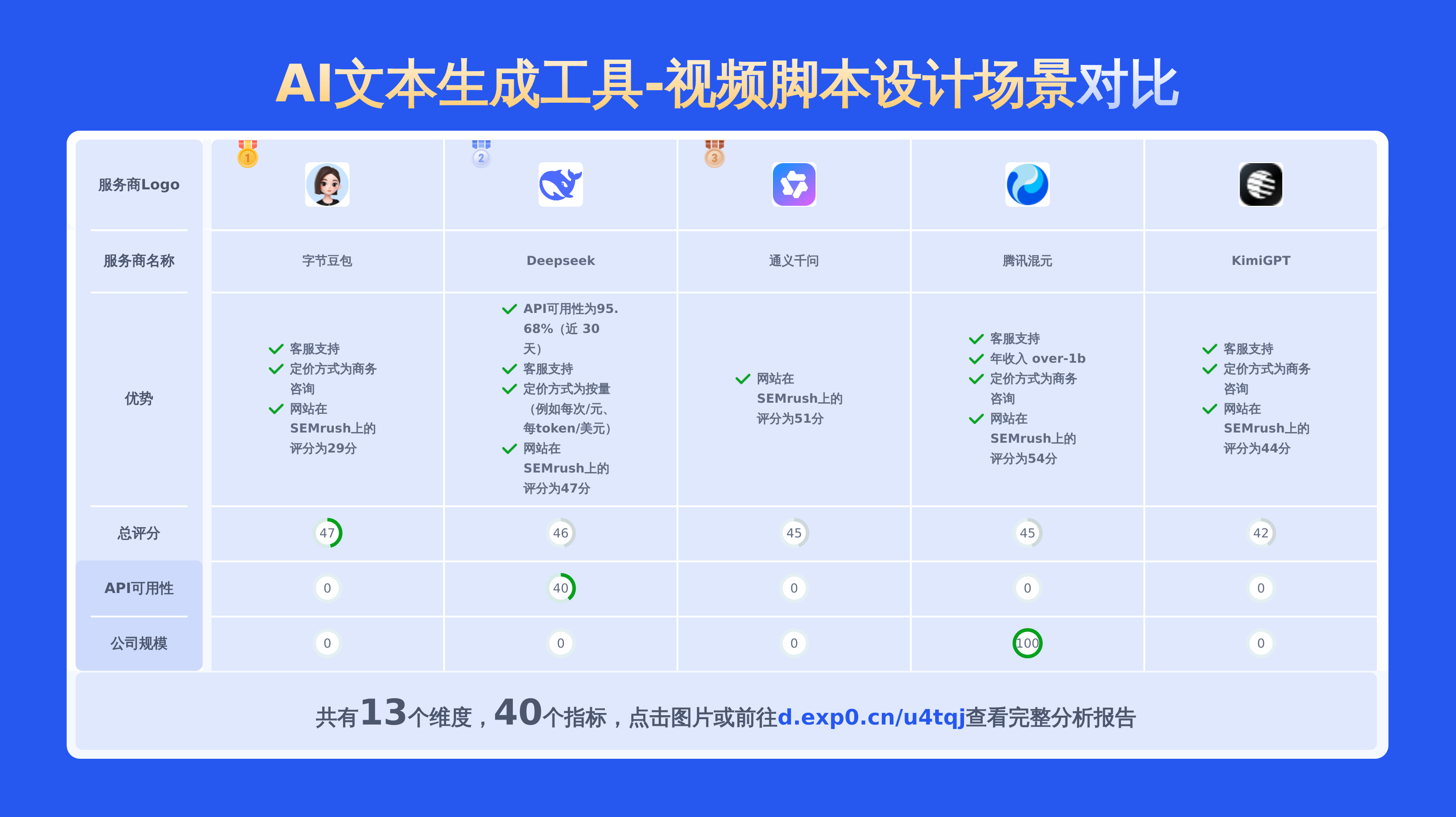 AI文本生成工具-视频脚本设计场景是一种利用人工智能技术自动生成视频脚本的解决方案,其在影视制作、广告创意、内容营销等领域具有重要应用价值。本文针对5个服务商分别从视频脚本生成能力、产品优势、基础技术参数、核心性能指标来进行对比。我们提供了一份详细的比较报告,涵盖多维度分析和丰富的数据对比,帮助用户快速了解服务商的特点,做出专业、明智的选择。