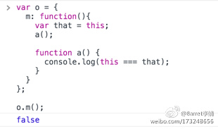 this 上下文只存在两种语义,一种是被当作方法调用,this 指向调用它的对象;一种是作为函数调用,指向 Global 对象(严格模式下为 undefined)。它没有作用域的限制,如下图所示,a 由于是作为函数被调用,所以它指向的是 window,故而返回 false。