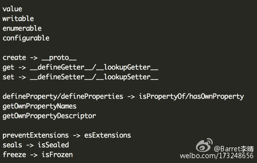 Object 的 freeze 方法过于严格;defineGetter/lookupGetter 和对应的 Setter 是很好用的属性。