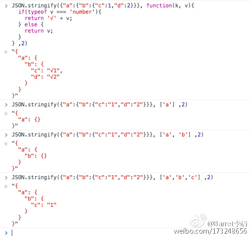 JSON.stringify 接受三个参数,很多人都知道第三个参数可以设置空白字符来美化输出,但是你可能不知道第二个参数的作用,它为 {Array|Function} 类型,如果为 Array 则用于过滤 key,如果为 Function 则可以对 value 做处理,如图所示。
