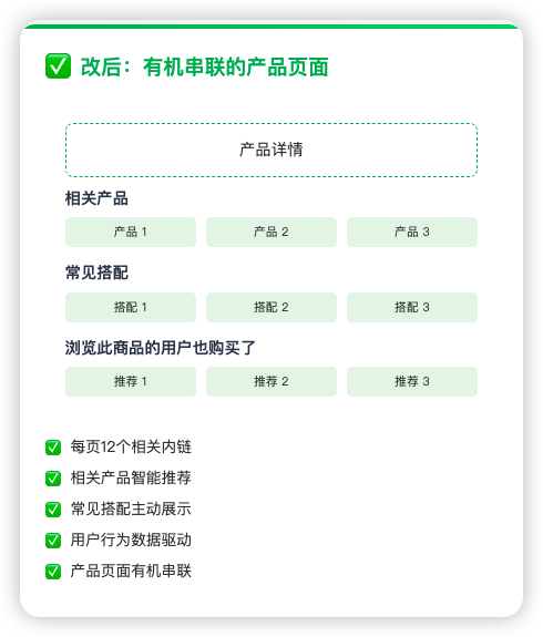 我们在产品页面策略性地增加了"相关产品"、"常见搭配"和"浏览此商品的用户也购买了"等内链模块,平均每个页面的有效内链从3个增加到12个,将孤立的页面有机地串联起来。