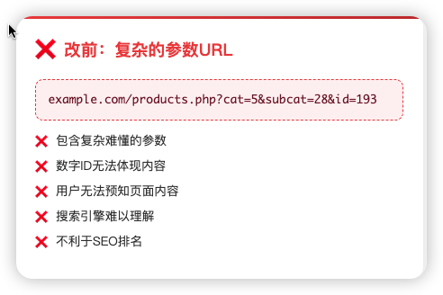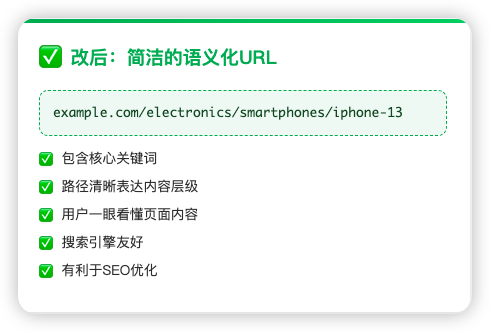 我们将复杂难懂的参数,替换为简洁、包含核心关键词的静态URL,让用户和搜索引擎都能一眼看懂页面内容。
