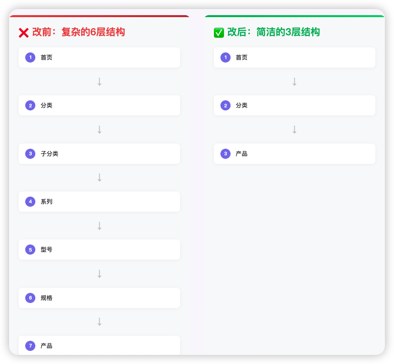 我们将网站层级从混乱的6层大刀阔斧地减少到清晰的3层,确保任何页面都能在3次点击内从首页到达。