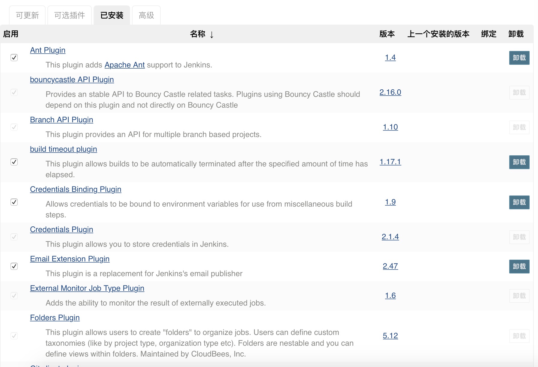 搭建Android自动化打包环境需要安装Gradle插件,如果使用Git还需要Git的插件,安装Jenkins时默认已经安装了这两个插件。如果没有安装可以进入“系统管理>管理插件”进行插件的安装。