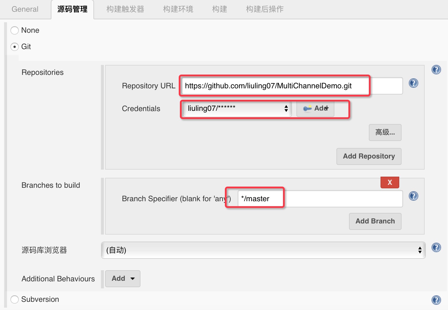 构建项目,当然得有代码了。Jenkins支持使用版本控制工具来进行源码管理,比如Git或者SVN。这里我使用的是Git,项目使用的是我的github上面的一个多渠道打包的demo。在Repository URL中输入项目地址,点击Add按钮添加认证信息,然后选择构建的分支,我这里使用的是master分支。
