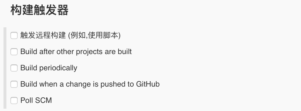 Jenkins支持上图所示的触发时机配置,如果都不选,则为手动构建,需要点击“立即构建”按钮才构建。