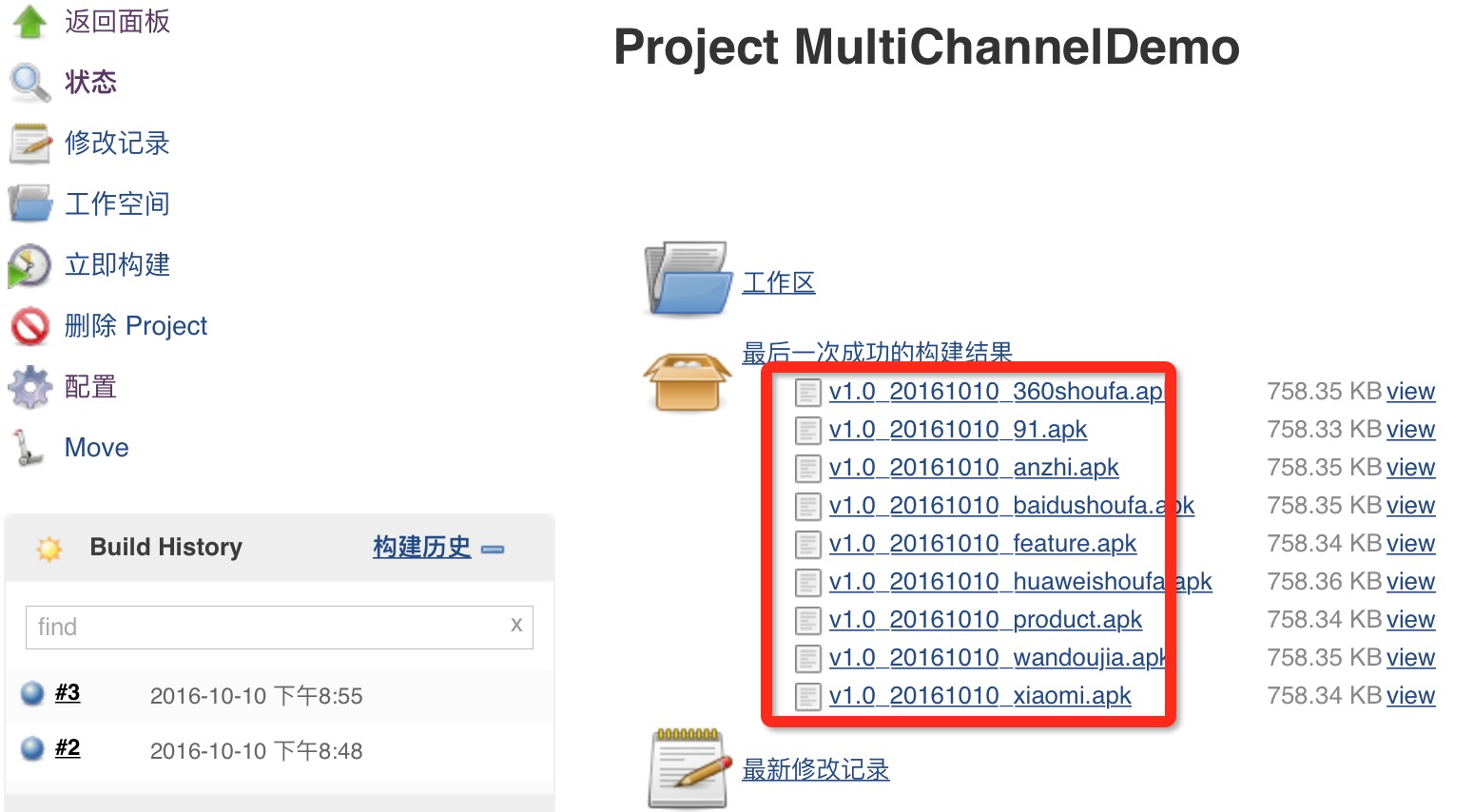 这里我配置了Archive the artifacts,在“用于存档的文件”中填写需要存档的文件名,可以使用通配符。比如上面我配置了app/build/outputs/apk/v*.apk,表示疑v开头的apk文件都存档。构建完之后在任务首页可以下载存档的文件。