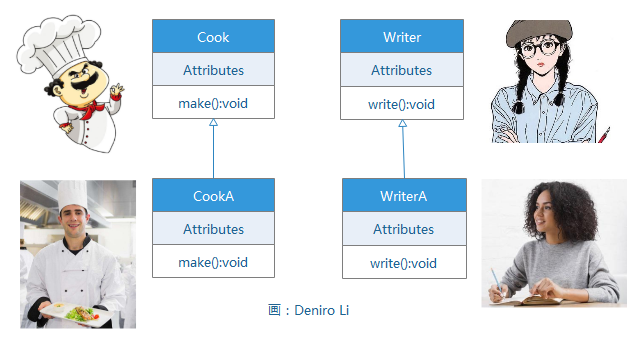 假设,有以下这些类继承关系,包括厨师接口与作家接口,每个接口都有一个实现类: