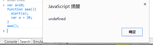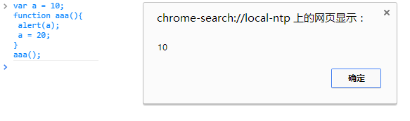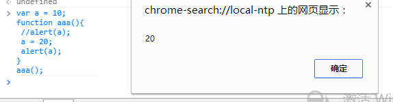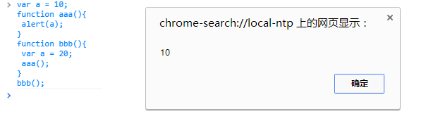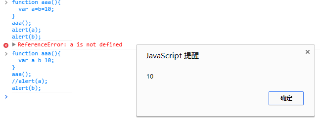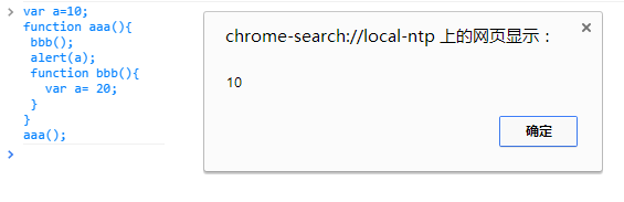 这是因为在alert(a)的时候,bbb函数中的a确实为20 ,可是它对于这时的alert(a)这句话来说是局部的,alert(a)根本找不到bbb函数中的a,所以在aaa函数中它找不到a,于是乎去外面找,一找,就找到了10。