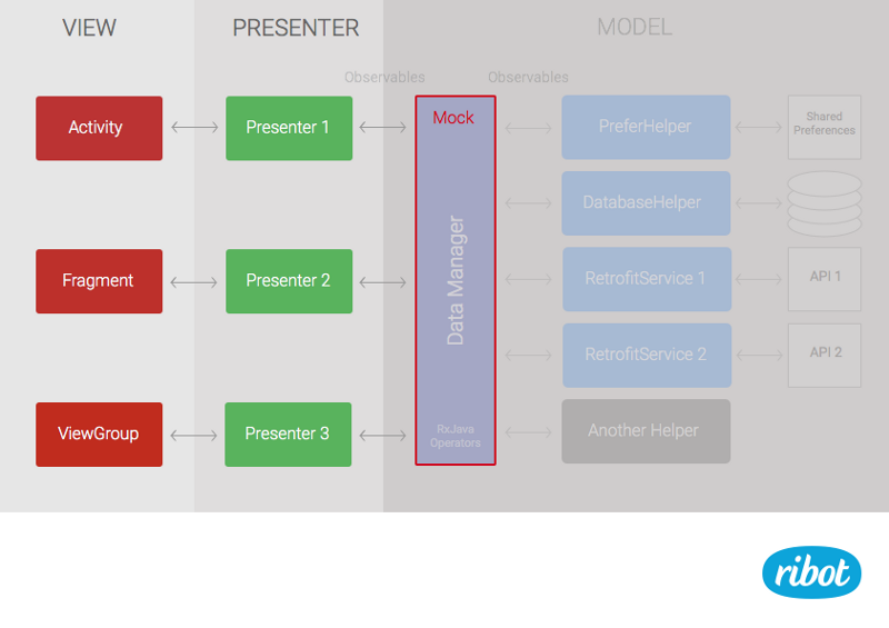 构建一个易于测试的架构有许多种方式。在这里我将使用 ribot 中使用的架构 (译者注:也就是在开篇提到的Android应用架构)作为范例,你也可以应用这样的架构方式到任何架构中。我们的架构是基于MVP模式,我们决定在UI测试中去模拟(mock)整个Model层,因此我们可以对数据由更多的操作性,也就能够写出更有价值和可靠的测试。