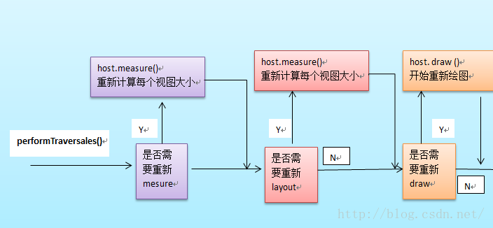 整个View树的绘图流程是在ViewRoot.Java类的performTraversals()函数展开的,该函数做的执行过程可简单概况为根据之前设置的状态,判断是否需要重新计算视图大小(measure)、是否重新需要安置视图的位置(layout)、以及是否需要重绘 (draw)