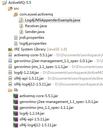 创建project:ActiveMQ-5.5,并导入apache-activemq-5.5.1\lib目录下需要用到的jar文件,项目结构如下图所示: