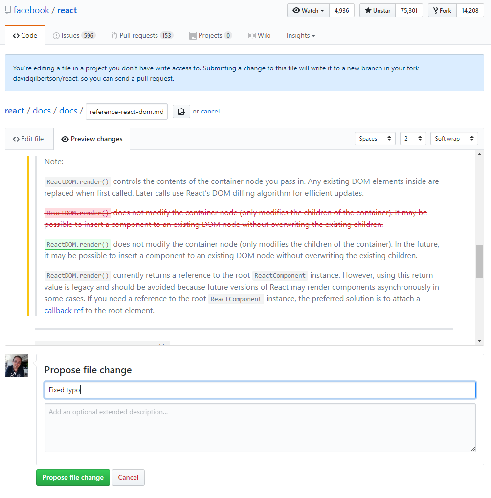 当你登录到 GitHub ,查看一个文件时(任何文本文件,任何版本库),右上方会有一只小铅笔。点击它,你就可以编辑文件了。 当你编辑完成后,GitHub 会给出文件变更的建议,然后为你复刻fork该仓库并创建一个拉取请求pull request(PR)。