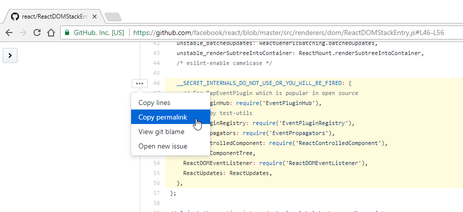 分享这个 URL 将会链接到这个文件的那些行。但等一下,链接所指向的是当前分支。如果文件发生变更了怎么办?也许一个文件当前状态的永久链接permalink就是你以后需要的。