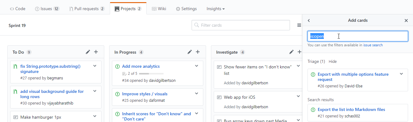 你可以点击右上角的添加卡片Add Cards,然后找你想要添加的东西。在这里,特殊的搜索语法就派上用场了,举个例子,输入 is:pr is:open 然后现在你可以拖动任何开启的 PR 到项目面板上,或者要是你想清理一些 bug 的话就输入 label:bug。