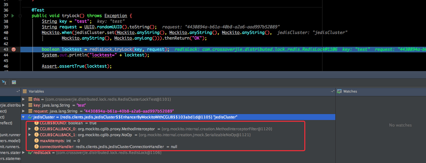 Mockito.anyString(), Mockito.anyLong())).thenReturn("OK"); boolean locktest = redisLock.tryLock(key, request);
