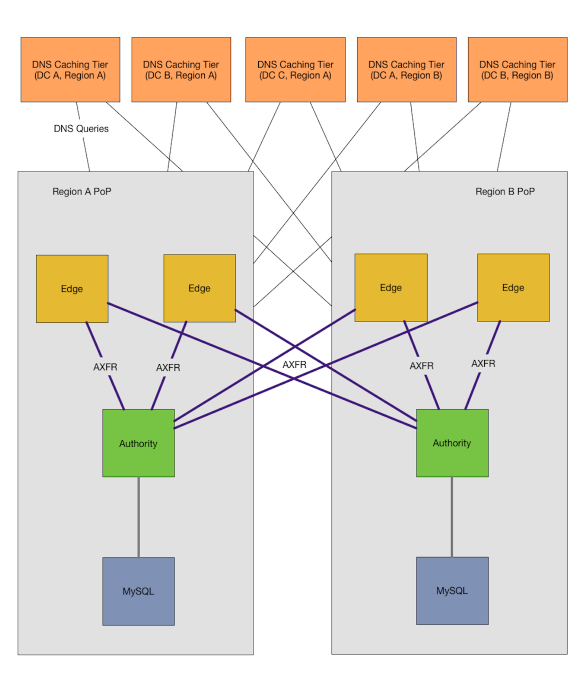 为了构建这个系统,我们确定了三类主机:缓存主机cache、边缘主机edge和权威主机authority。缓存主机作为递归解析器recursive resolver和 DNS “路由器” 缓存来自边缘层的响应。边缘层运行 DNS 权威守护程序,用于响应缓存层对 DNS 区域zone的请求,其被配置为来自权威层的区域传输zone transfer。权威层作为隐藏的 DNS 主服务器master,作为 DNS 数据的规范来源,为来自边缘主机的区域传输zone transfer提供服务,并提供用于创建、修改或删除记录的 HTTP API。