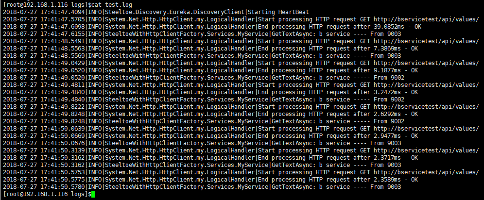 从动图来看,是已经达到预期了,由于BSERVICETEST有两个实例,所以也可以看到上面的结果是,两个实例在随机返回结果。