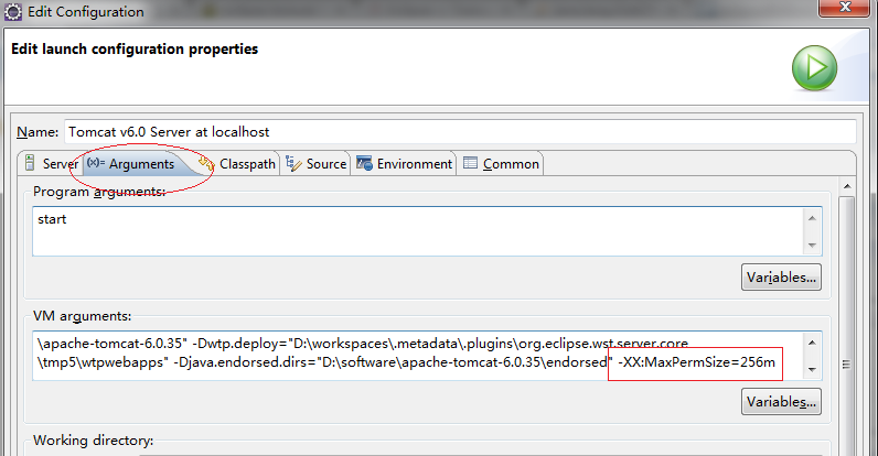 如上图在VM arguments文本框内设置 -XX:MaxPermSize=256m的值即可, 当然此处还可以添加其他jvm参数,比如最大内存,最小内存等。