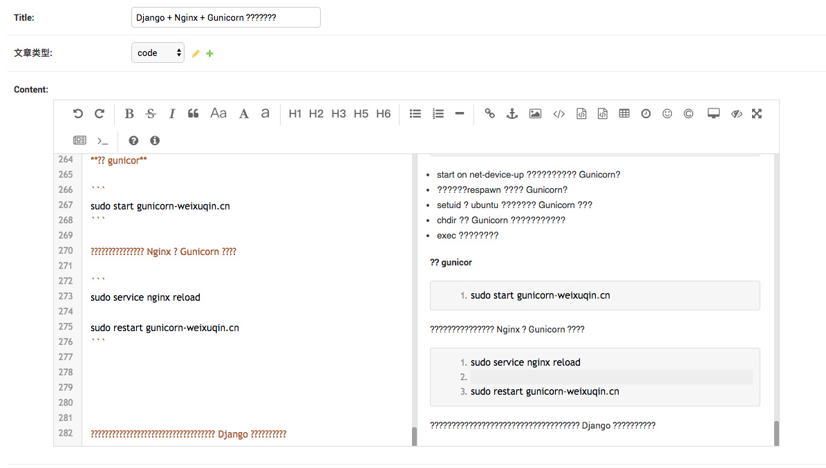 删除原来创建的数据库,并重新创建一个同名数据库,执行 python manage.py migrate , 再次打开后台编写文章,我们的文章便不再显示乱码了。