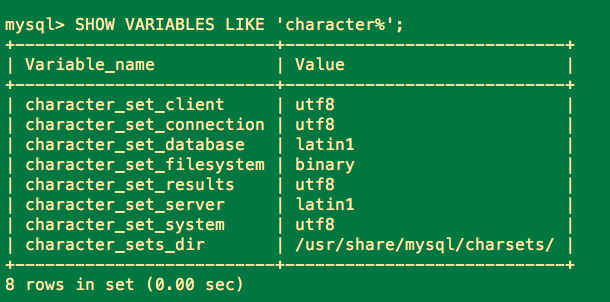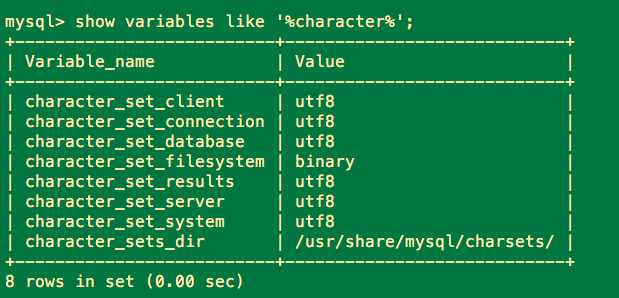 [client]default-character-set=utf8[mysqld]character-set-server=utf8[mysql]default-character-set=utf8