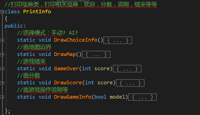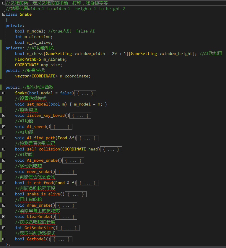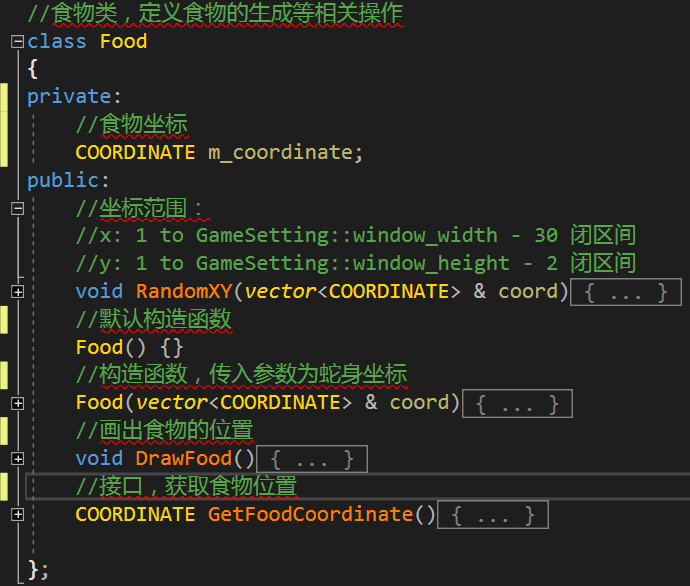食物类定义了食物的坐标,随机生成规则,和画出食物等一系列操作。其中食物坐标我们用了一个结构体: