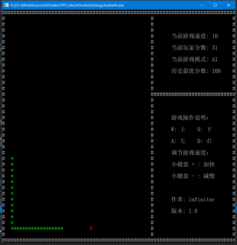 刚学完C++。一时兴起,就花几天时间手动做了个贪吃蛇,后来觉得不过瘾,于是又加入了AI功能。希望大家Enjoy It.