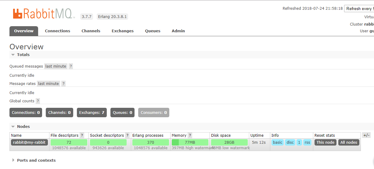已经启动完成,浏览器直接访问服务器地址即可,默认的端口为:5672,web管理的端口为:15672,默认用户和密码为:guest。