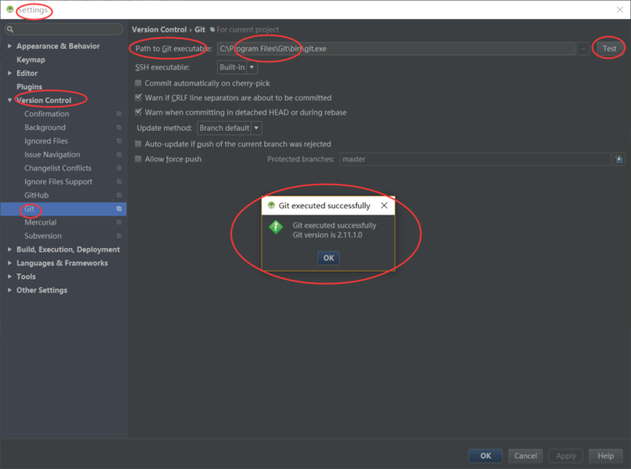 在Android Studio中点击Settings-->Version Control --> Git,然后在Path To Git executable上输入你刚刚安装Git的位置,最后点击Test按钮出现Git executed successfully说明配置成功,如下图: