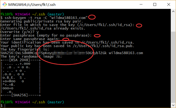 第一个Enter表示Keys存储的位置,默认按回车键即可。第二个和第三个Enter表示Push文件的时候要输入的密码,不需要密码就默认按回车键即可,然后出现如图底部信息就说明创建成功了!