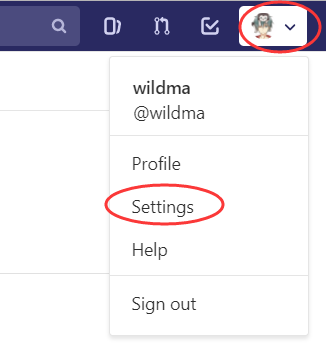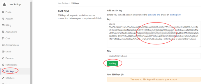 进入上图所示存储 id_rsa.pub 的文件夹拷贝该文件中的内容,然后登录你的GitLab账号,点击网页右上角的头像-->Settings,点击左边菜单栏的 SSH Keys 进入页面添加 SSH key。如下操作: