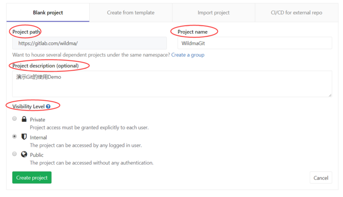 Visibility Level:可见登记,Private表示私有的,只有你自己或者组内的成员能访问,Internal表示所有登录的用户,Public表示公开的,所有人都可以访问。