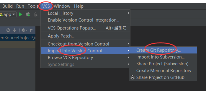 点击Android Studio顶部菜单栏上的VCS-->Import into Version Control-->Create Git Repository,如图: