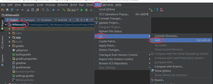 选中项目的根目录,点击Android Studio顶部菜单栏上的VCS-->Git-->Add...,如下图: